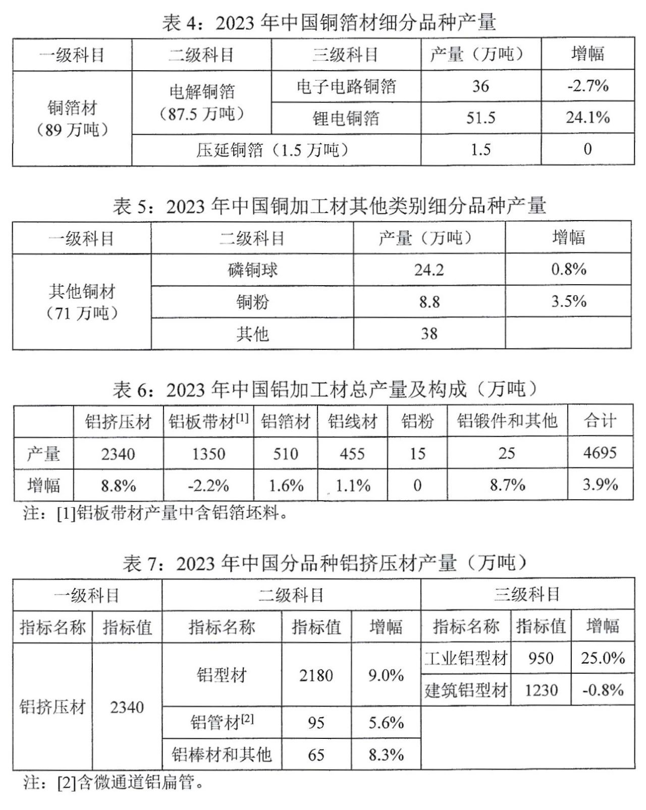 2023年,中國銅加工材綜合產(chǎn)量為2085萬噸,比上年增長3.0%。鋁加工材綜合產(chǎn)量為4695萬噸,比上年增長3.9%,其中剔除鋁箔坯料后的鋁加工材產(chǎn)量為4115萬噸,比上年增長4.2%。銅鋁加工材細分品種產(chǎn)量和鋁擠壓材表面處理方式構(gòu)成詳見下表1至表11。